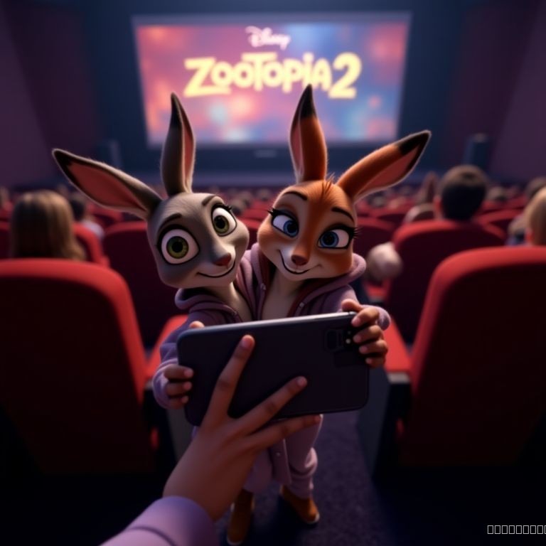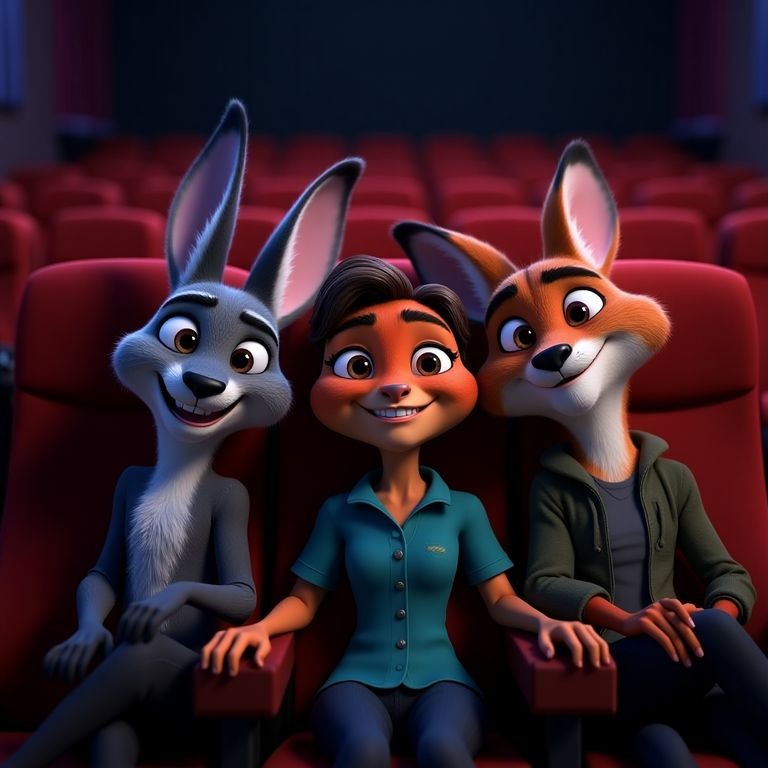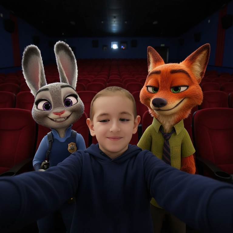 Make a close-up, high-resolution selfie of a beautiful woman [reference face on the photo] with Judy Hopps and Nick Wilde from Zootopia 2. Framing: Tight selfie framing with faces filling the frame. Judy Hopps holds the camera, positioned slightly forward for a natural arm’s-length selfie angle. The woman and Nick lean in on each side. Slightly elevated angle with natural close-distance distortion. Characters: Judy and Nick appear exactly like their original film versions but integrated into real life with natural lighting, realistic shadows, and depth. Their faces fill the frame, animated design preserved. Posing (cute, funny, playful): All three lean in close for a lively, adorable selfie: – Judy, holding the phone, has a bright, excited, super cute expression — big sparkling eyes, slightly open-mouth smile, ears tilted in a playful uneven angle. – The woman leans closer with a soft, natural smile, slightly puffing her cheeks for added cuteness. – Nick makes a funny-cute face — lightly squishing his own cheeks or tilting his head with a bashful, charming smile, giving a silly and cute vibe. Their tight grouping creates an intimate, chaotic-fun selfie energy. The selfie should look like it’s taken directly from Judy’s front camera, with arm-length perspective and mild iPhone selfie distortion, making the framing feel close and personal. Outfit (unisex): Neutral lilac hoodie and dark jeans. Lighting: Warm ambient cinema lighting before the movie starts — soft diffused overhead light plus subtle glow from the big theater screen. Background: Rows of cinema seats with audience members visible. The top of the frame shows the bright “Zootopia 2” poster on the large cinema screen. Important: Ultra-realistic; natural sharpness and depth; real camera look; not digital or stylized; clean details on skin, fur (Nick), and Judy’s suit.