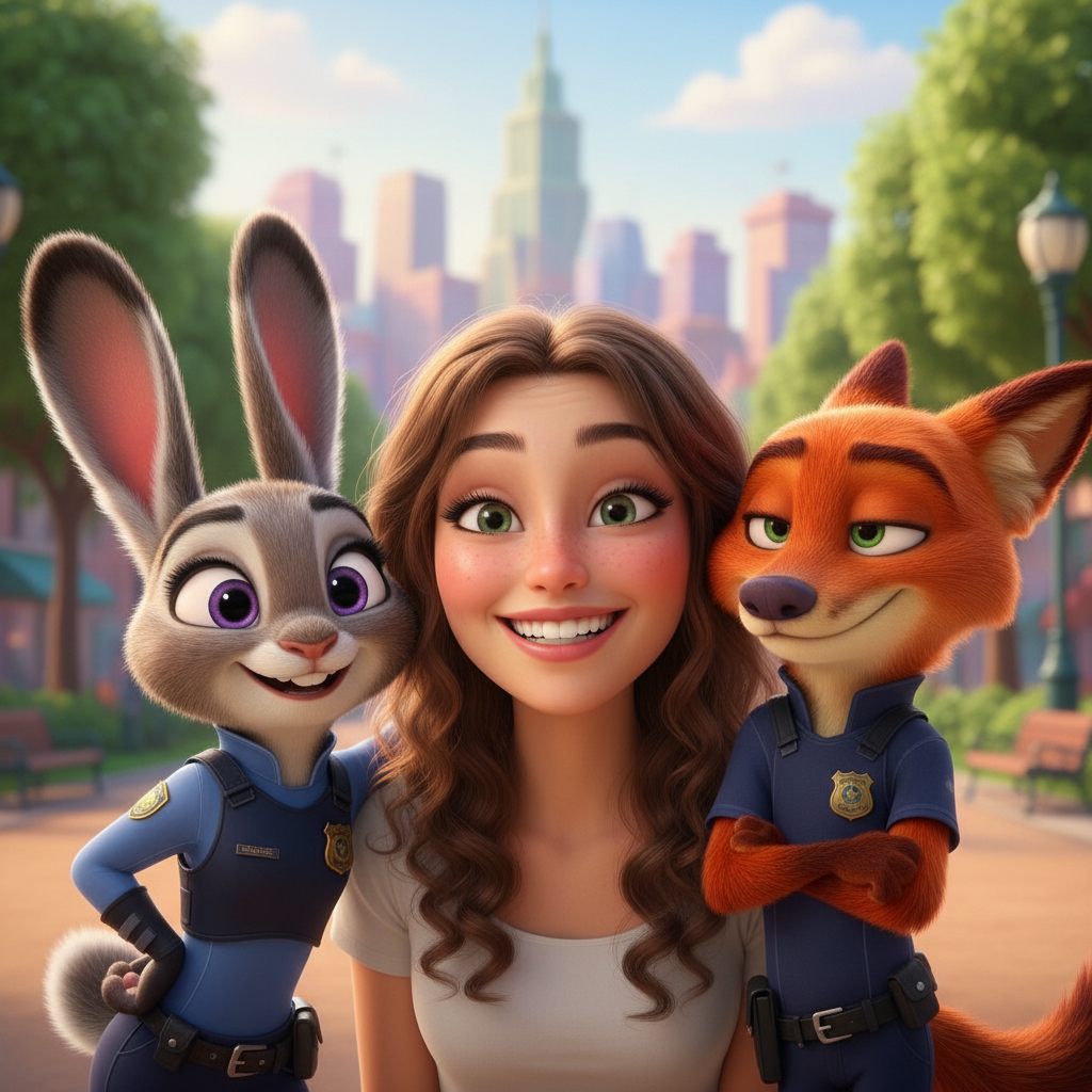 ![Make a close-up, high-resolution selfie of a beautiful woman [reference face on the photo] with Judy Hopps and Nick Wilde from Zootopia 2.